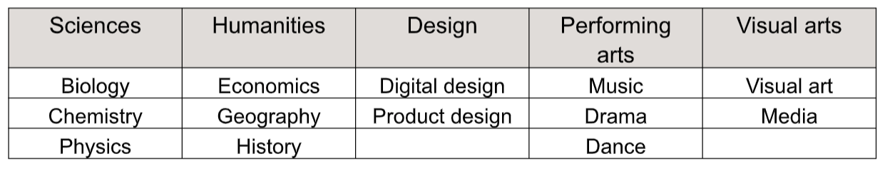 MYP acknowledges integrated courses. These courses exist within a subject group to combine knowledge from multiple disciplines over time using a holistic approach. Subject-group guides provide information on this topic. This table shows the formally designated integrated courses: