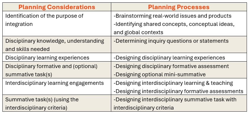 Designing meaningful interdisciplinary units demands careful considerations when planning. The table below includes the MYP’s considerations and correlating processes as indicated in the Interdisciplinary Teaching and Learning in the MYP document.